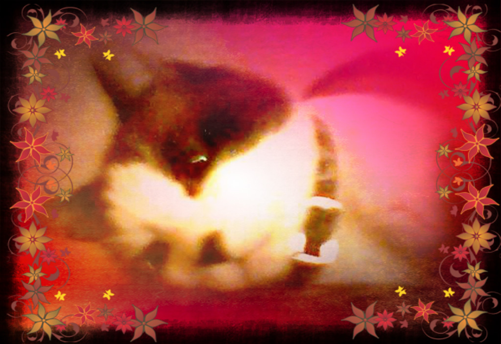 Good Morning dear readers, we are participating in Athena/Marie caturday art hop. The seasons are changing and we took a cute photo of Frankie lying on top of the computer. It didn't turn out so well, so it became another art photo. We used are favourites picmonkey and pizap. We used a red overlay on the photos and tried various flower frames. We wanted it to look warm for fall. Frankie looks grumpy this was taken before the trip to the vet. He's now a lot happier having taken prednizone for the current asthma situation. Hope everyone has a great day and purrs and zen hugs to all.